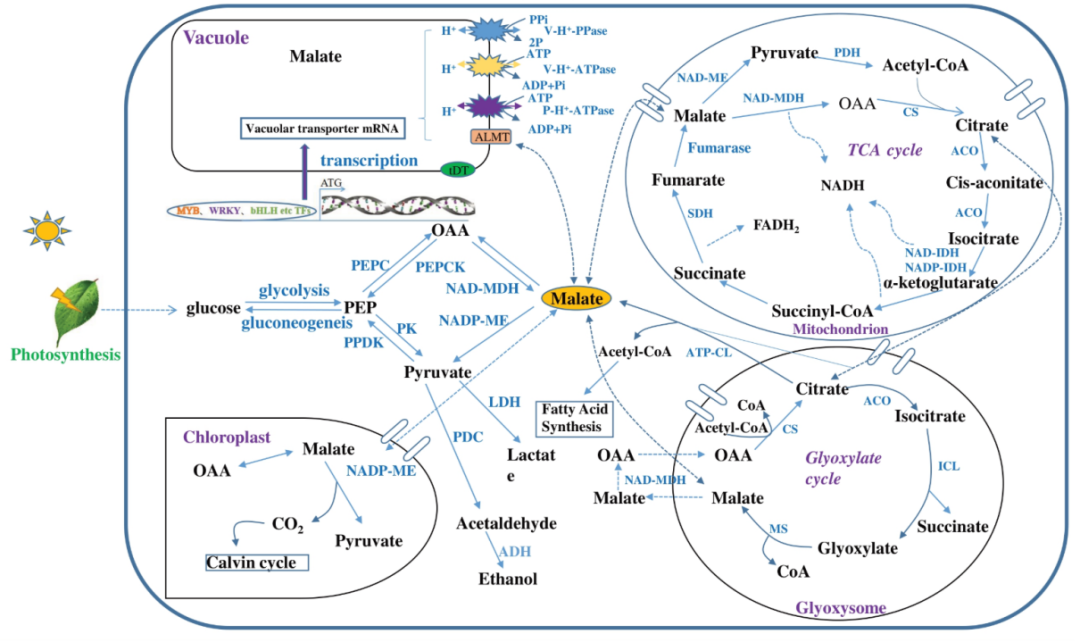 化學名稱為羥基丁二酸,是一種廣泛存在于植物體內(nèi)的二羧酸,常以蘋果酸酯的形式分布于根、莖、葉和果實等組織器官中。它不僅直接影響果實風味與品質(zhì),還作為關(guān)鍵代謝底物,參與細胞質(zhì)中的糖酵解、線粒體內(nèi)的三羧酸循環(huán)(TCA)以及乙-醛酸循環(huán)等過程,為植物提供能量[1]。作為連接碳水化合物、脂質(zhì)和蛋白質(zhì)代謝的核心節(jié)點,蘋果酸代謝構(gòu)成一個涉及多細胞器協(xié)作的復(fù)雜網(wǎng)絡(luò)系統(tǒng)。